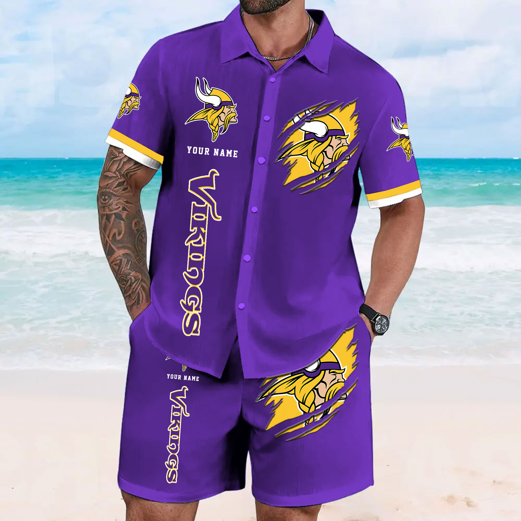 With our Made-to-Order service, you can personalize your Hawaiian Shirt and Shorts Set by adding your own name alongside the iconic Minnesota Vikings Football design, making it truly one-of-a-kind.