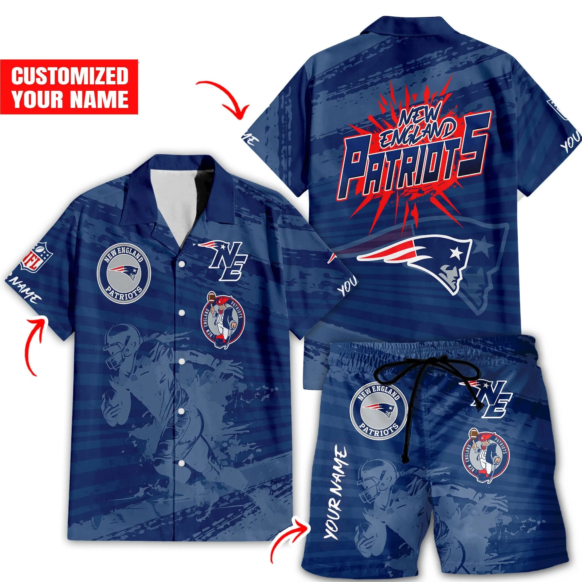 With our Made-to-Order service, you can personalize your Hawaiian Shirt and Shorts Set by adding your own name alongside the iconic New England Patriots Football design, making it truly one-of-a-kind.