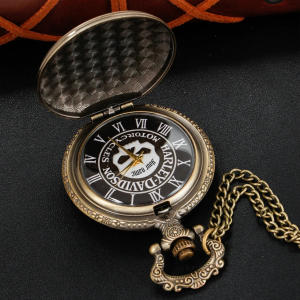 - This handsome pocket watch also comes with a 15″ stainless steel chain with pocket clasp.