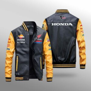 - This llight-weight Honda leather jacket with a high collar, full-zip front, and side seam pockets completes a stylish look for cool weather.